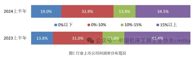 利潤率分布情況見圖2。與上年相比,利潤率在0%以下企業數占比上升5.2個百分點; 0%-10%占比上升1.7個百分點;10%-15%占比與上年同期持平;15%以上占比下降6.9個百分點。