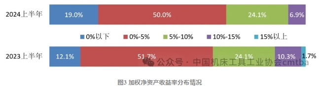 加權平均凈資產收益率分布情況見圖3。與上年同期相比,加權平均凈資產收益率0%以下的企業數占比上升6.9個百分點; 0%-5%占比下降1.7個百分點;5%-10%占比持平; 10%-15%占比下降3.4個百分點;15%以上占比下降1.7個百分點。