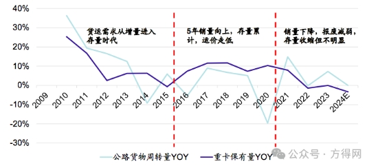 從需求端觀察,自2013年以來,公路貨運周轉量基本保持微幅波動。從供給端分析,產業政策對重卡銷量周期產生較大影響,2016至2021年間運力單邊上行,導致后續運輸利潤下滑。然而,隨著2021年重卡年銷量下降,預計至2024年,重卡保有量增速將連續四年低于貨運需求增速。但由于2016至2021周期重卡存量大幅增長,銷量修復進程較為緩慢。