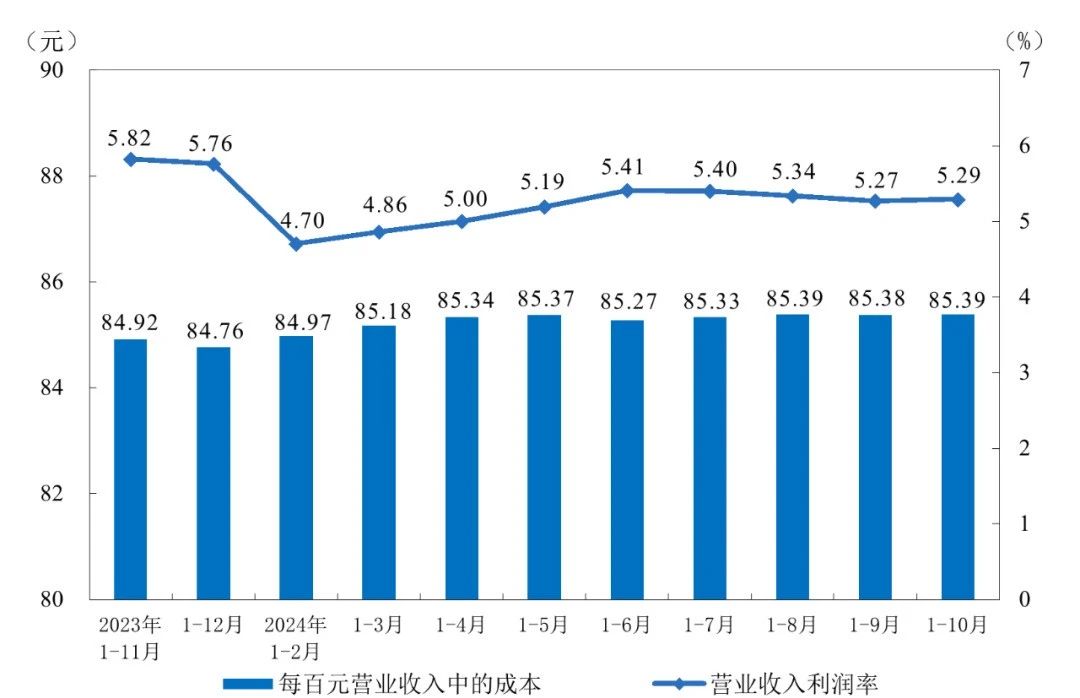 1—10月份,規(guī)模以上工業(yè)企業(yè)實現(xiàn)營業(yè)收入110.96萬億元,同比增長1.9%;發(fā)生營業(yè)成本94.75萬億元,增長2.3%;營業(yè)收入利潤率為5.29%,同比下降0.34個百分點。