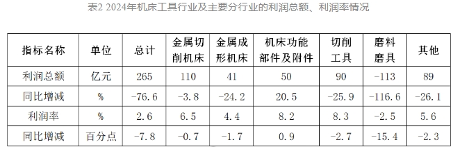 2024年,機(jī)床工具行業(yè)實(shí)現(xiàn)利潤(rùn)總額265億元,同比下降76.6%。利潤(rùn)率為2.6%,同比下降7.8個(gè)百分點(diǎn)。