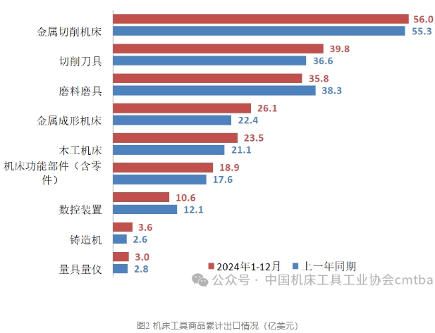 2024年,機(jī)床工具行業(yè)整體出口同比增幅較上年度擴(kuò)大2.8個(gè)百分點(diǎn)。其中,金屬切削機(jī)床、金屬成形機(jī)床、木工機(jī)床、機(jī)床功能部件(含零件)、切削刀具、量具量?jī)x等產(chǎn)品的出口都實(shí)現(xiàn)了增長(zhǎng),其中金屬成形機(jī)床和木工機(jī)床的出口更是呈兩位數(shù)增長(zhǎng),對(duì)行業(yè)的整體運(yùn)行起到重要的支撐作用。