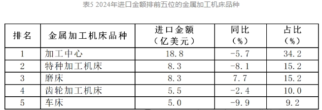 2024年進(jìn)口前五位的金屬加工機(jī)床品種及其進(jìn)口金額,詳見表5。