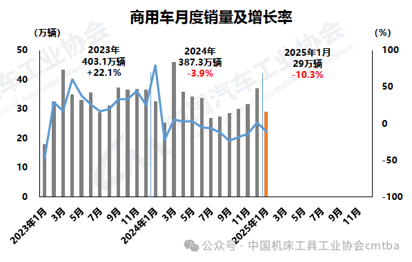 1月,商用車產銷分別完成29.9萬輛和29萬輛,環比分別下降17.2%和21.2%,同比分別下降8.6%和10.3%。在商用車主要品種中,與上月相比,客車和貨車產銷均呈兩位數下降;與上年同期相比,客車產銷小幅增長,貨車產銷呈兩位數下降。1月,在貨車細分品種中,與上月相比,四大類貨車品種產銷均呈不同程度下降。