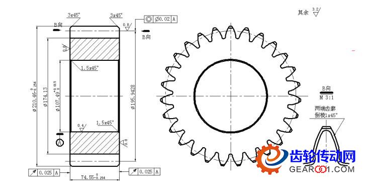 以美國TEREX TR100驅(qū)動橋輪邊減速器一級行星輪的原廠圖紙為例,詳見圖1所示(出于保密,對原圖和超精加工無關(guān)部分進行多處刪改)。
