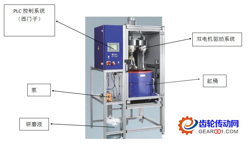加工時齒輪沉入磨料內(nèi),在裝有磨料的缸筒內(nèi)做環(huán)狀運動,通過與磨料顆粒的互相摩擦起到互相研磨和拋光的作用。粗研+精研+拋光的全過程齒輪只需一次裝夾,分三次更換缸桶,用裝有不同的磨料分別進行粗、精研磨和拋光。缸桶及磨料不轉(zhuǎn),通過控制系統(tǒng)控制雙電機驅(qū)動系統(tǒng)實現(xiàn)齒輪的正、反轉(zhuǎn),帶動和實現(xiàn)齒輪在磨料缸桶內(nèi)旋轉(zhuǎn),以實現(xiàn)齒輪的研磨和拋光。