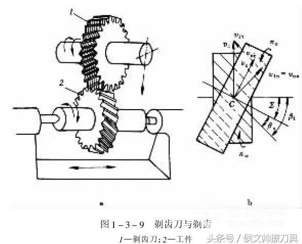 (1)剃齒 剃齒在原理上屬展成法加工,如圖1-3-9所示。所用刀具稱為剃齒刀,它的外形很象一個斜齒圓柱齒輪,齒形作得非常準確,并在齒面上開出許多小溝槽,以形成切削刃。在與被加工齒輪嚙合運轉過程中,剃齒刀齒面上眾多的切削刃,從工件齒面上剃下細絲狀的切屑,以提高齒形精度和減小齒面粗糙度值。